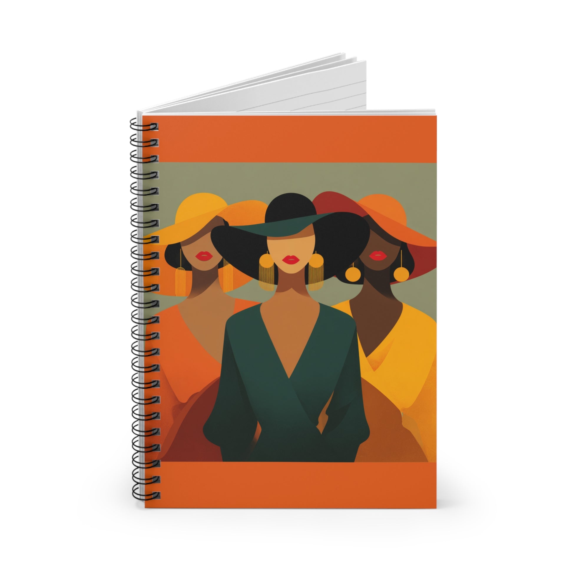 Make every word feel luxurious with the Timeless Grace Spiral Notebook, part of the Luxe Essence Edition. This refined cover design features three elegant women in wide-brim hats and flowing garments, styled in bold shades of emerald green, golden yellow, and fiery orange. Accented with statement earrings and vibrant red lips, they embody sophistication, confidence, and unshakable poise.