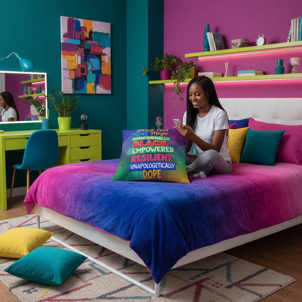 This vibrant throw pillow is more than just décor—it’s an affirmation of identity and strength. Featuring a bold collage of empowering words like “Black Girl Magic,” “Phenomenally Black,” “Empowered,” “Resilient” and “Unapologetically Dope,” it adds a splash of color and a whole lot of inspiration to any room. The dynamic typography pops against a kaleidoscopic background, making it a standout piece that celebrates Black womanhood and reminds everyone of their inherent power.